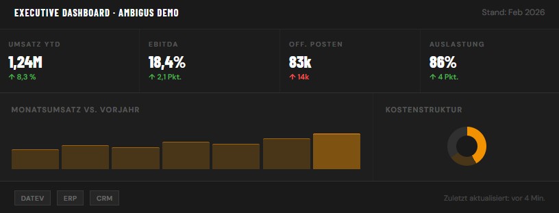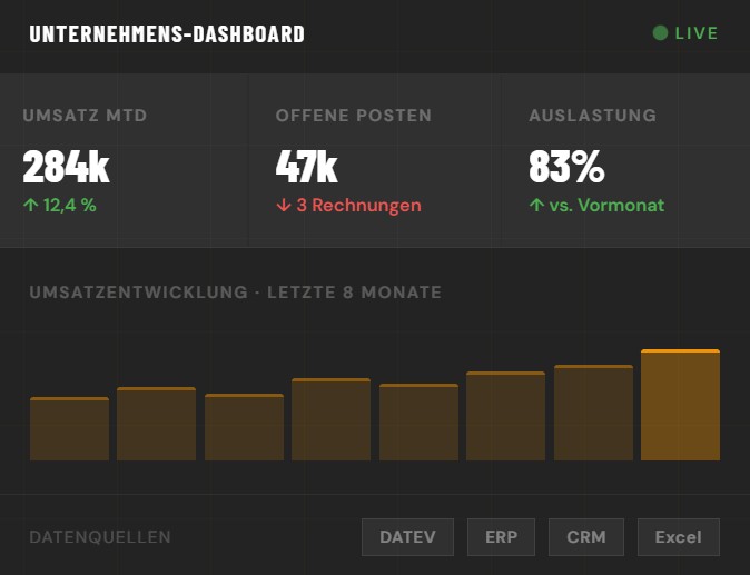 Die meisten mittelständischen Unternehmen sitzen auf einem Schatz an Daten – und nutzen ihn kaum. DATEV, ERP, Excel: Zahlen existieren, aber ein verlässliches Gesamtbild fehlt. Entscheidungen werden aus dem Bauch heraus getroffen, obwohl die Grundlage längst vorhanden wäre.